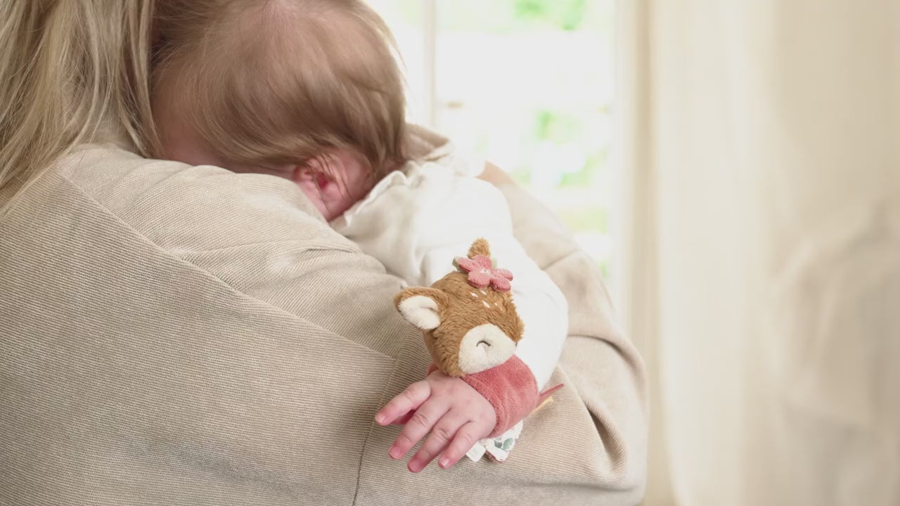 The Little Dutch Deer Wrist Rattle from the Fairy Garden collection is a delightful first toy for newborns and young babies. Made from ultra-soft, baby-safe fabrics, this adorable rattle wraps comfortably around your baby’s wrist with a gentle Velcro closure. When your little one moves, the sweet deer character makes a soft rattling sound, encouraging early sensory play and motor skill development.