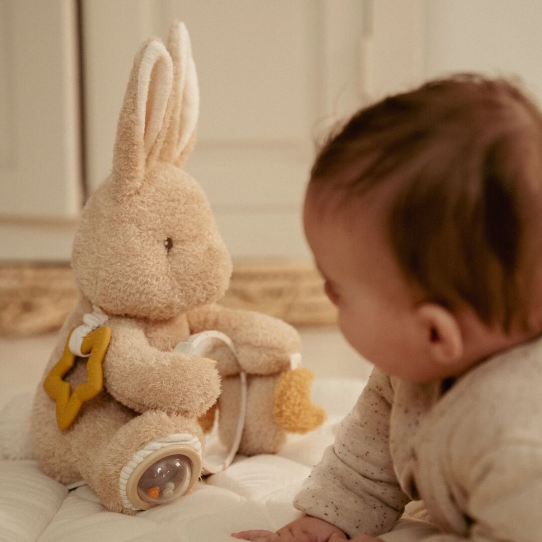 Meet the sweetest playtime companion, the Activity Cuddle Rabbit Baby Bunny in soft sand tones. This adorable plush bunny isn’t just cuddly; it’s full of little surprises to stimulate your baby’s senses and keep them entertained.