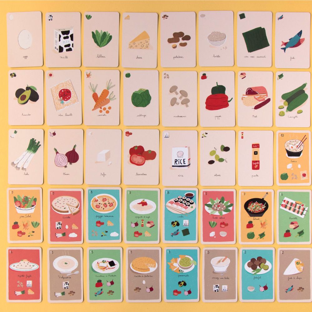 - Includes 17 recipe cards featuring dishes from around the world and 63 ingredient cards.
