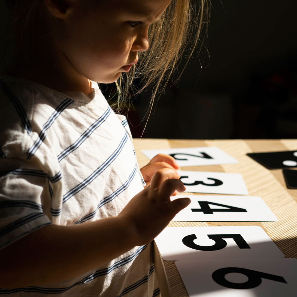 Each pack includes 24 double-sided Montessori-style cards, featuring two sets of numbers from 0–9, so children can place them together to count all the way up to 110. On the reverse, one set shows matching dots to support visual learning, while the other spells out each number word to encourage reading and number association.