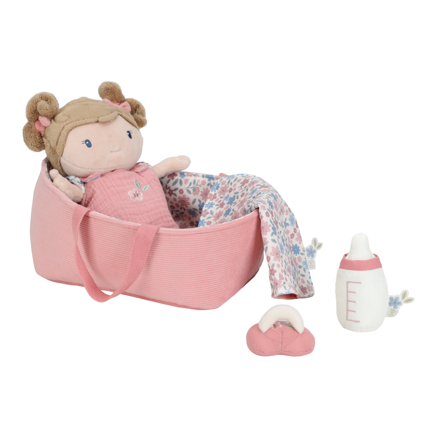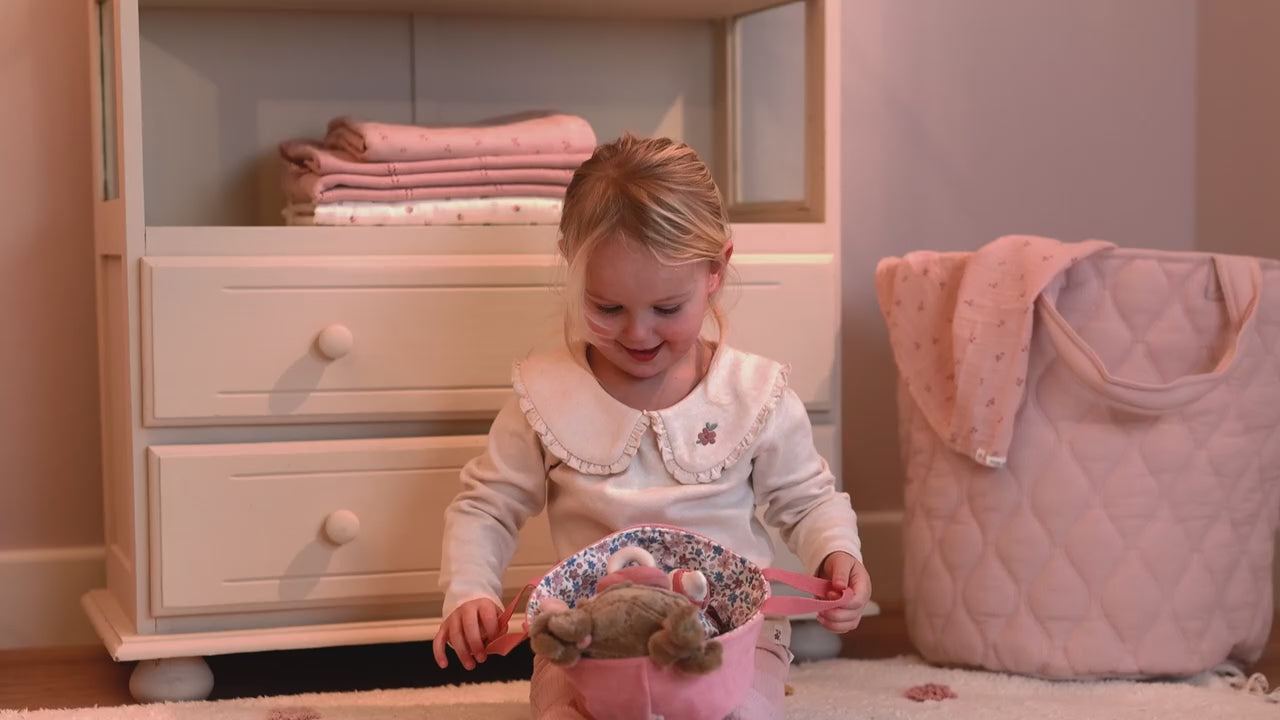 Meet baby doll Rosa, tucked up snugly in her soft travel basket. Dressed in a cosy sleeping bag, romper and removable nappy, she’s ready for lots of nurturing, caring play. Her magnetic dummy and bottle attach sweetly to her mouth, while the ribbed floral basket and matching blanket make this set perfect for taking along on every adventure.