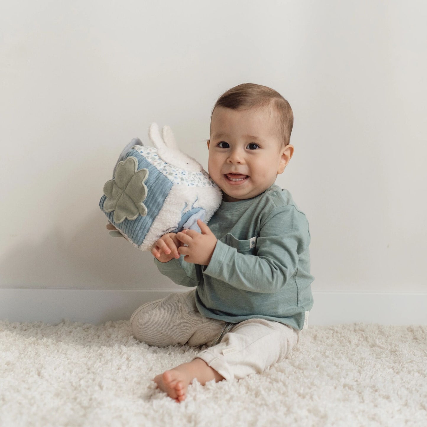 The Miffy x Little Dutch Activity Cube – Lucky Leaves is a beautifully soft and sensory-rich toy designed to support your baby’s development through exploration and play. Each side of the cube offers a different activity, including crinkly textures, a mirror, a rattle, labels to tug, and plush elements, all featuring the sweet Lucky Leaves print and the beloved Miffy bunny.