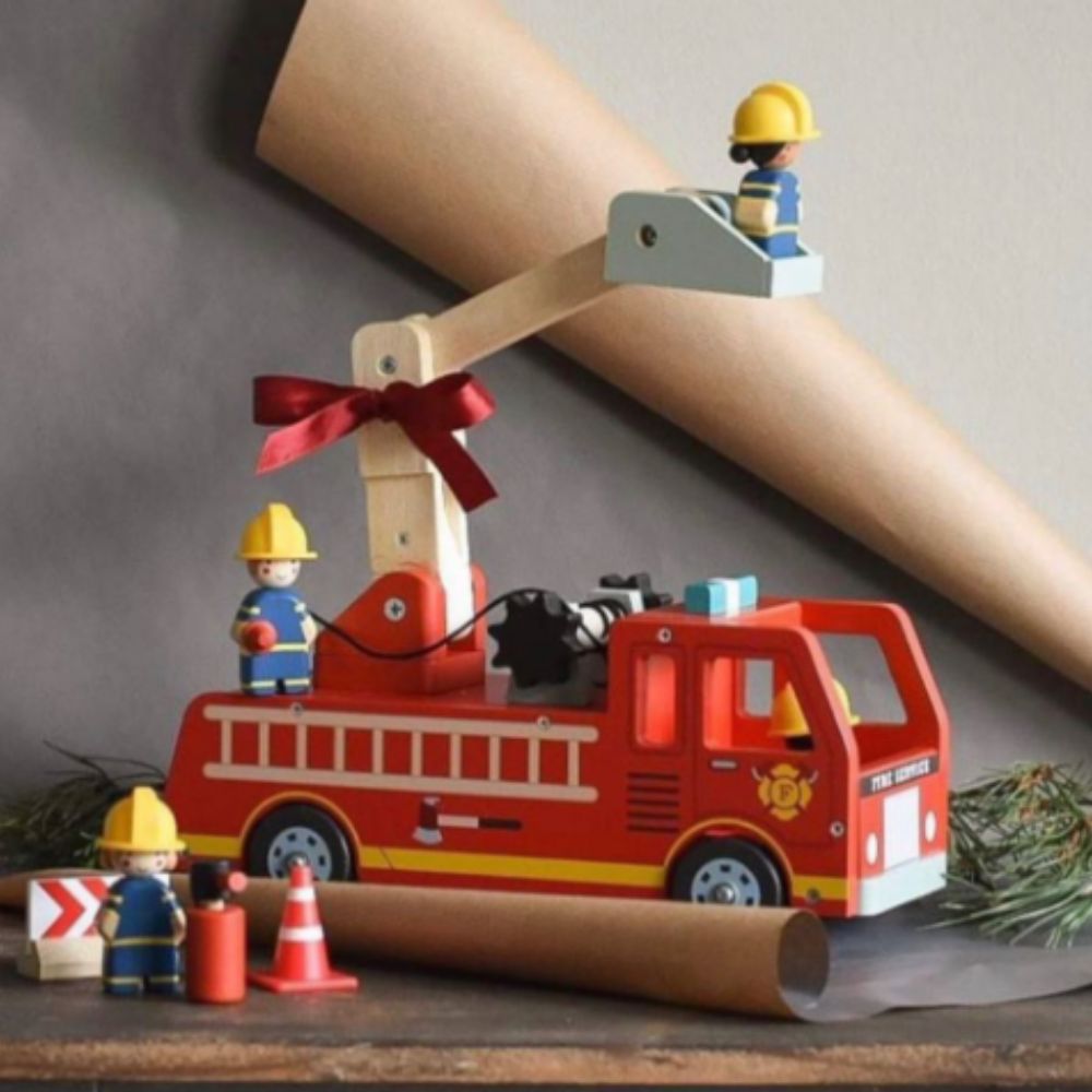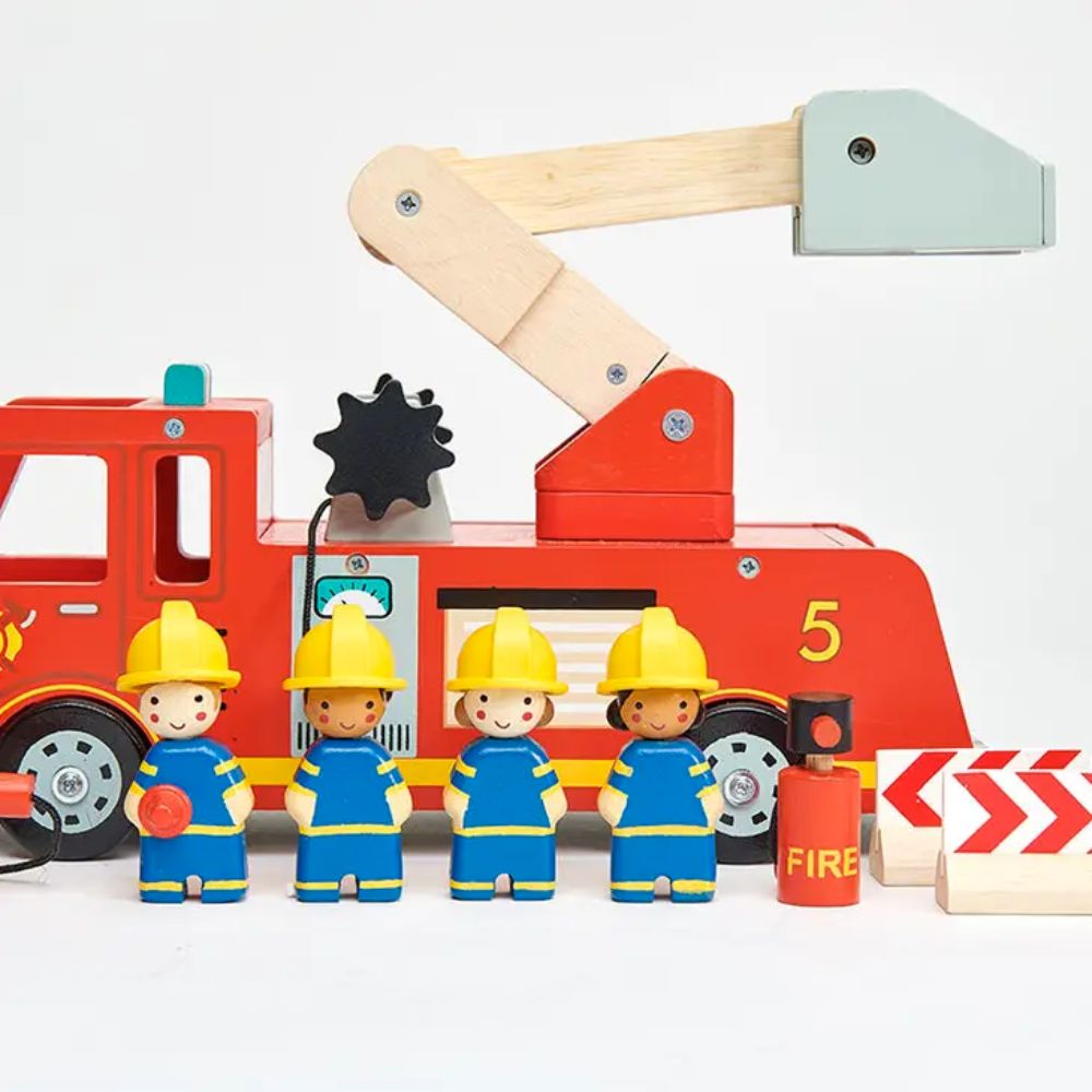 Calling all Firefighters! Time to be a hero and save the day! This bright fire engine has an unrolling hose and a natural wood extending arm to take the 4 firemen to dizzying heights to fight fires or rescue a kitten! Illustrated on all sides and evocative of children's book illustrations, this set is perfect for making up stories and language development as well as fine motor skills.