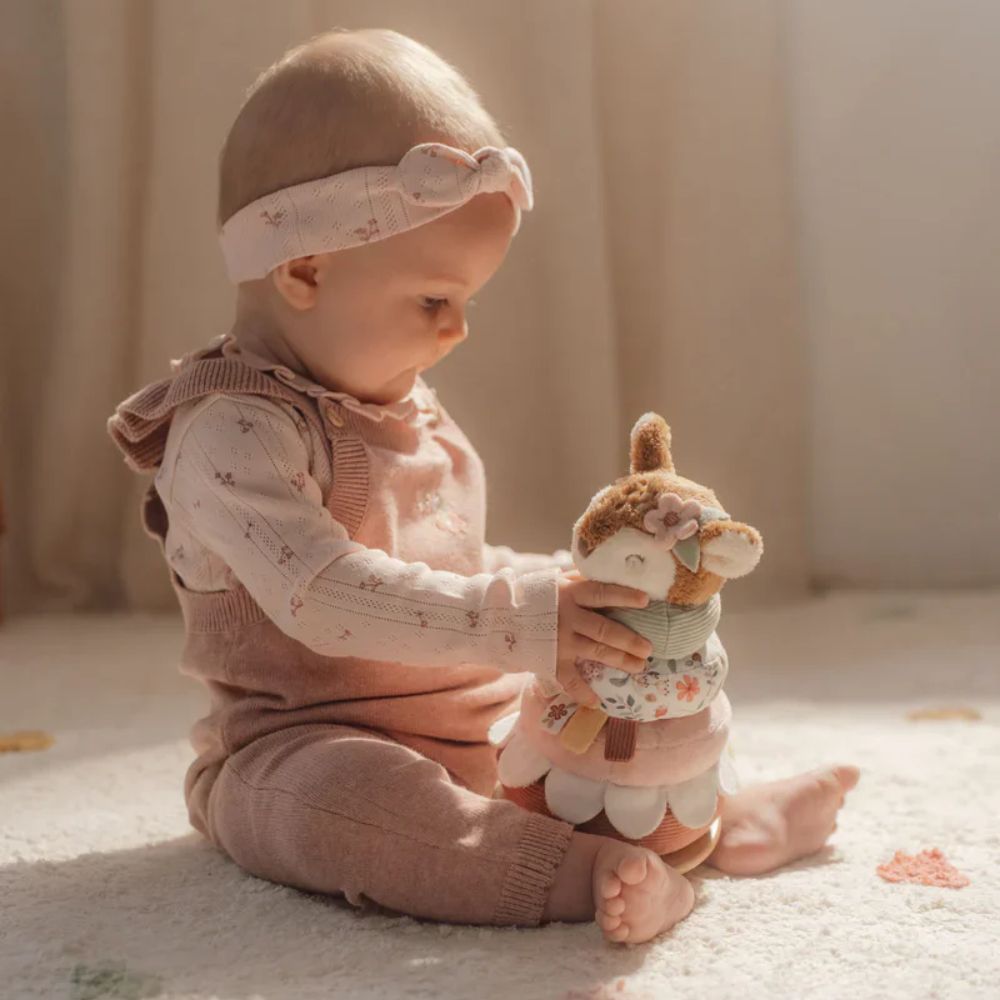 The Little Dutch Soft Little Deer Rocking Ring Stacker in the Fairy Garden range is a beautifully designed wooden toy that supports your baby’s fine motor skills, hand-eye coordination, and early problem-solving. Featuring soft, pastel-coloured rings in floral tones and topped with a sweet deer, this stacker gently rocks from side to side, adding a playful challenge to the stacking fun. A timeless addition to any nursery or toy shelf.