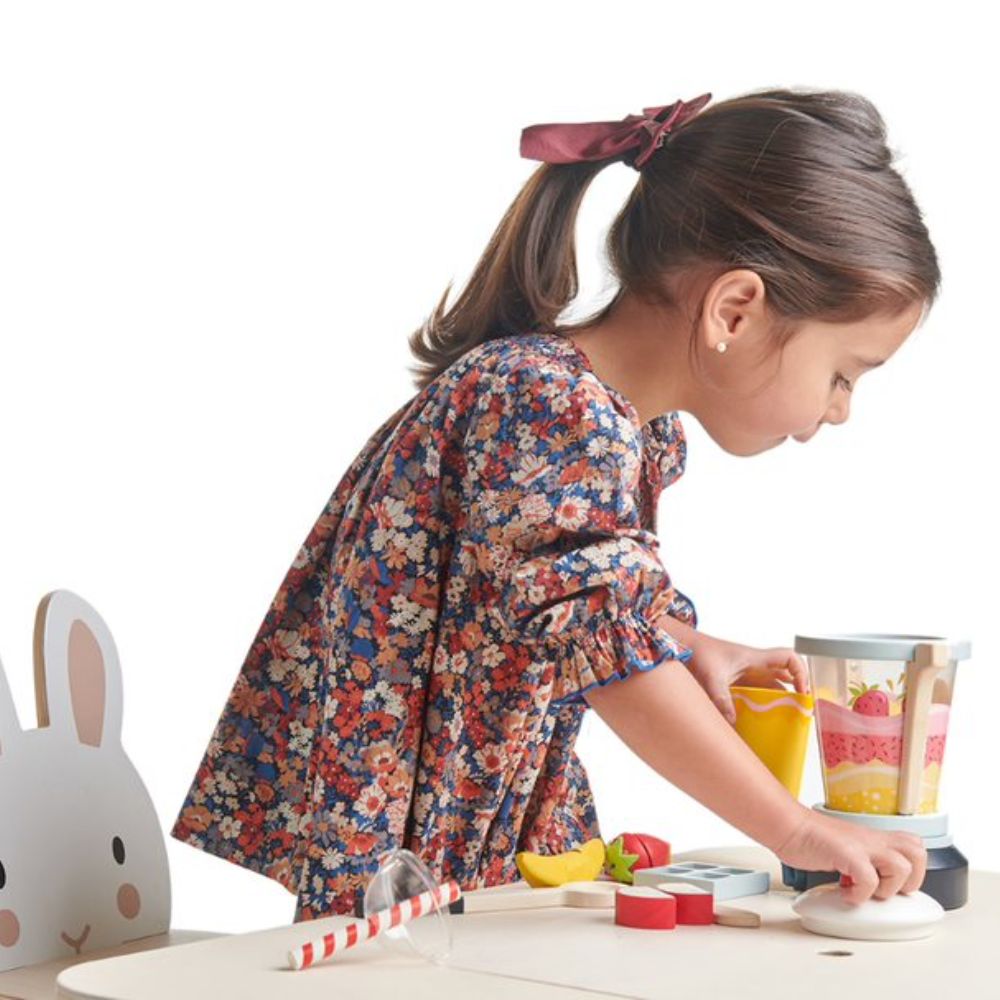 Wow there is so much fun to be had blitzing up berries with this smoothie maker! Cut the fruit with the wooden knife and pop it all into the stylish blender. Blend a strawberry, apple, banana, and orange into a delicious smoothie drink. Don’t forget to add the ice cubes and then pour into a take-away style beaker, with a stripy straw, and wooden stirrer. Brilliant for pretend imagination play, for practicing communication and fine motor skills.