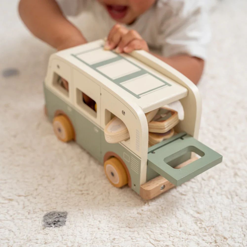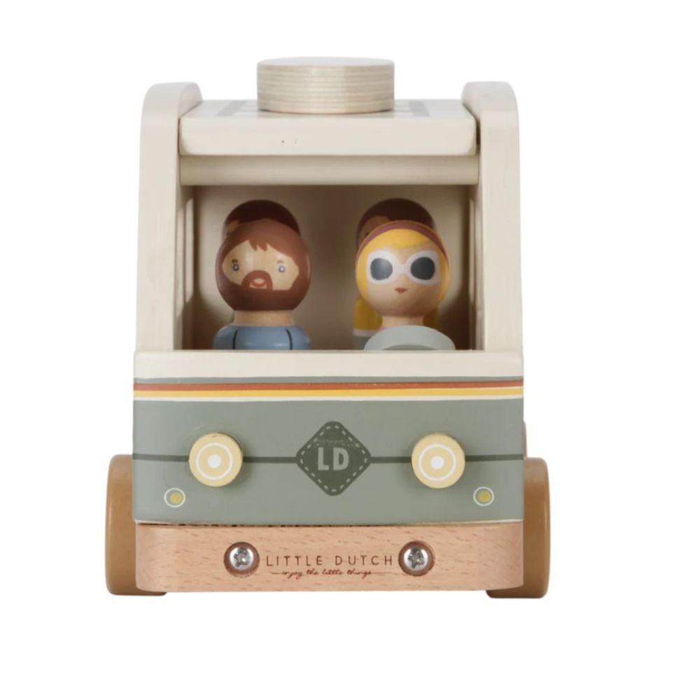 Pack your bags and hit the pretend-play road with the Little Dutch Wooden Campervan Play Set! This beautifully designed retro-style van comes with a full set of wooden peg doll figures, a surfboard, luggage, and picnic accessories – everything your little one needs for imaginative road trip adventures.